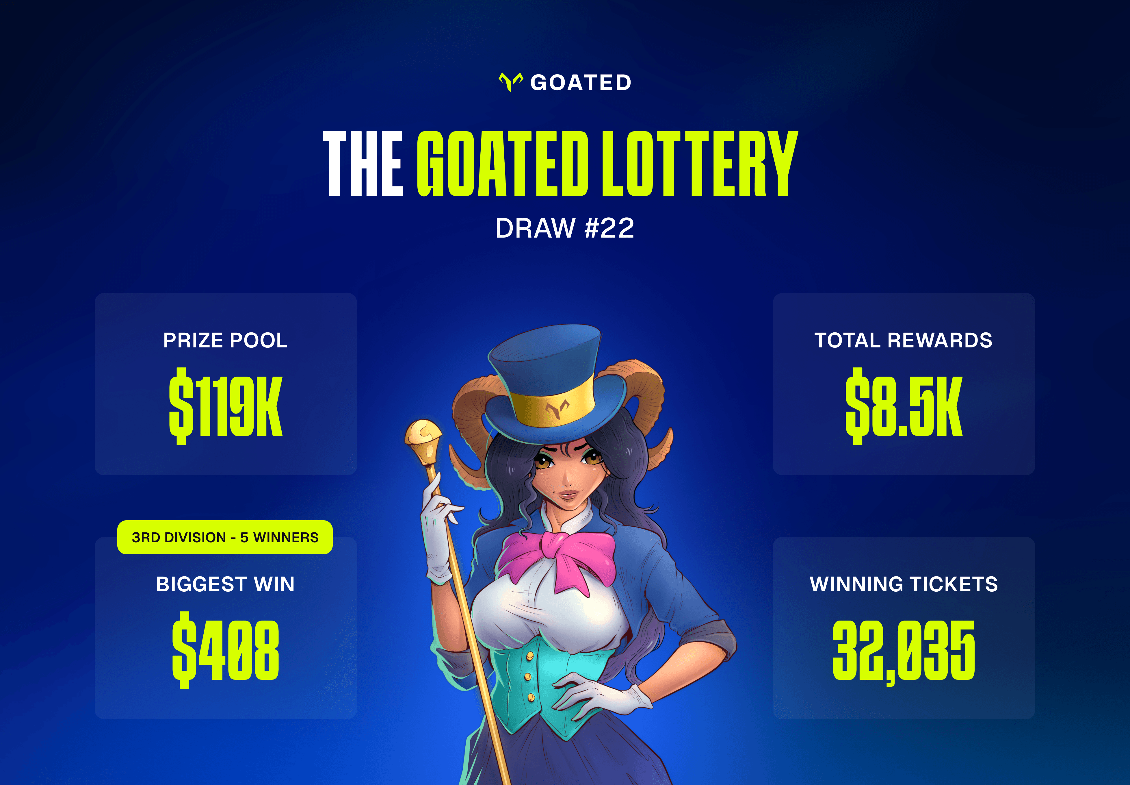 Yesterday's prizepool sat at a juicy $119K worth of $GOATED, with 5 winning tickets hitting the 3rd Division to win a total of $2,040.