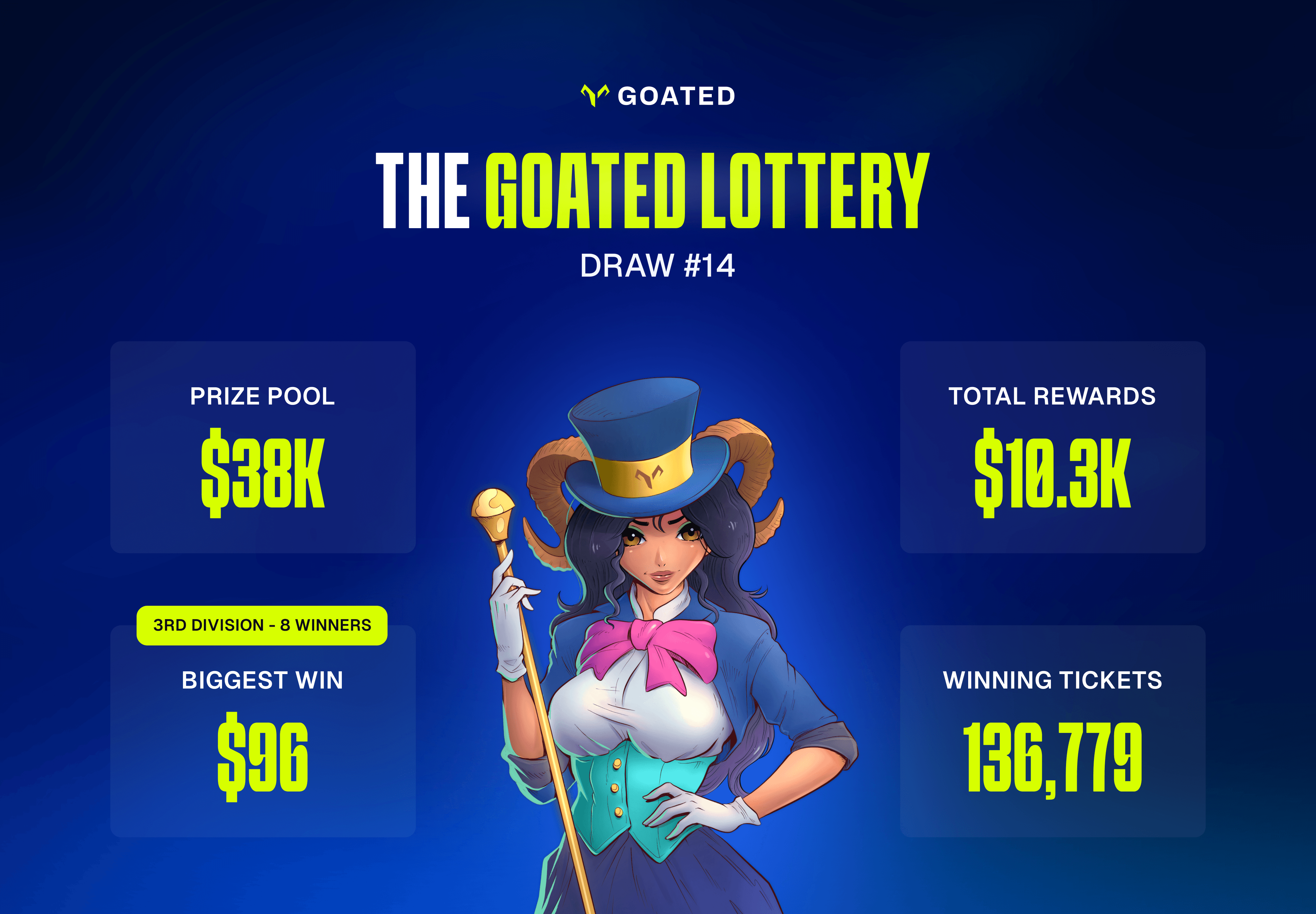 Goated Lottery Draw #14 dropped this week! We saw $38K in the prizepool, 8 winners hitting the 3rd Division and winning $96, and $10.3K in rewards split over 136+ tickets.