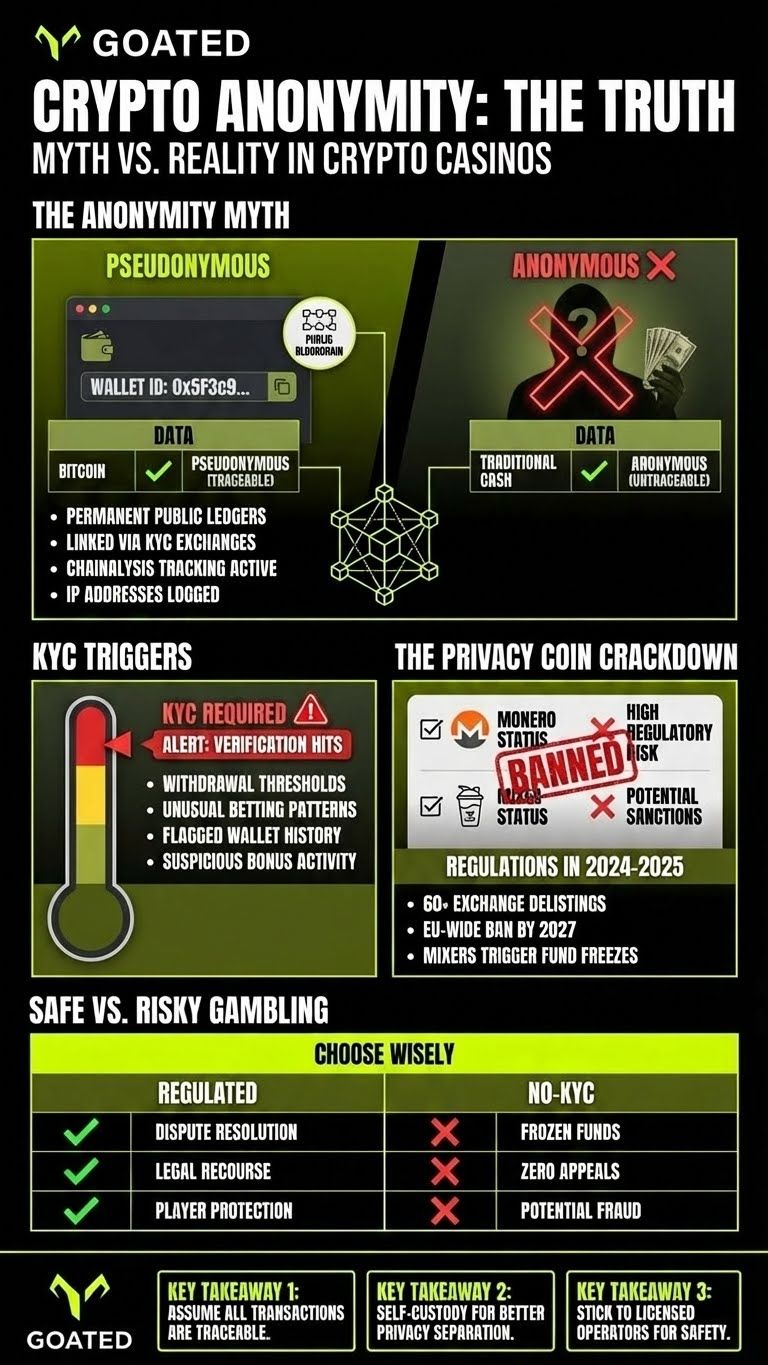 No, crypto casino transactions are not truly anonymous. Transactions on public blockchains like Bitcoin, Ethereum, and Solana are permanently recorded and visible to anyone. Identity can be linked through exchanges, wallet on-ramps, or blockchain analysis tools like Chainalysis. Most casinos require identity verification (KYC) before large withdrawals. Assume traceability and choose regulated operators.