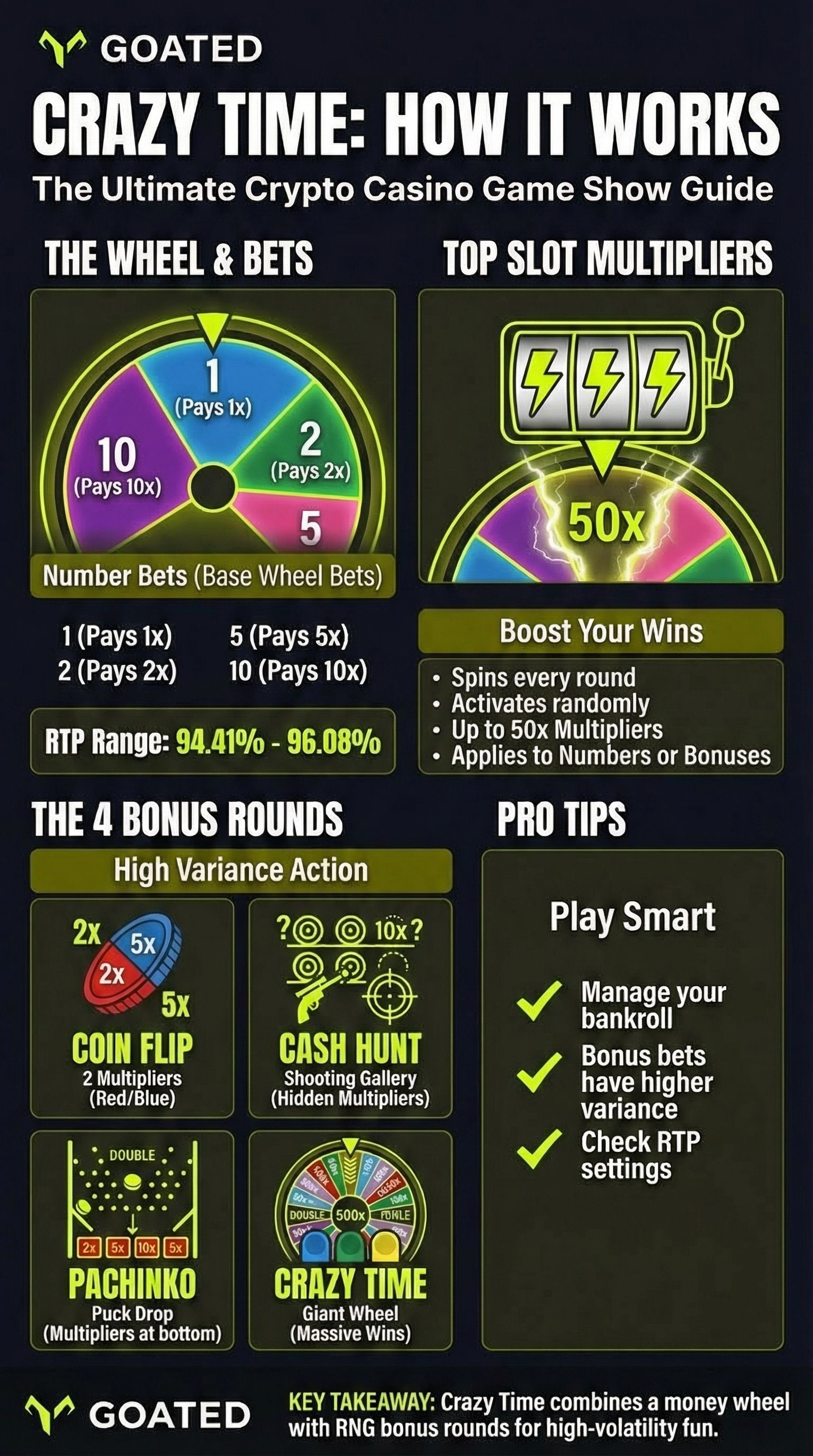 Use Goated to create a side-by-side card comparing Crazy Time with Monopoly Live and Dream Catcher highlighting wheel segments, number of bonus games, Top Slot multipliers, typical RTPs and volatility. This helps readers and search models instantly compare live game-show titles.