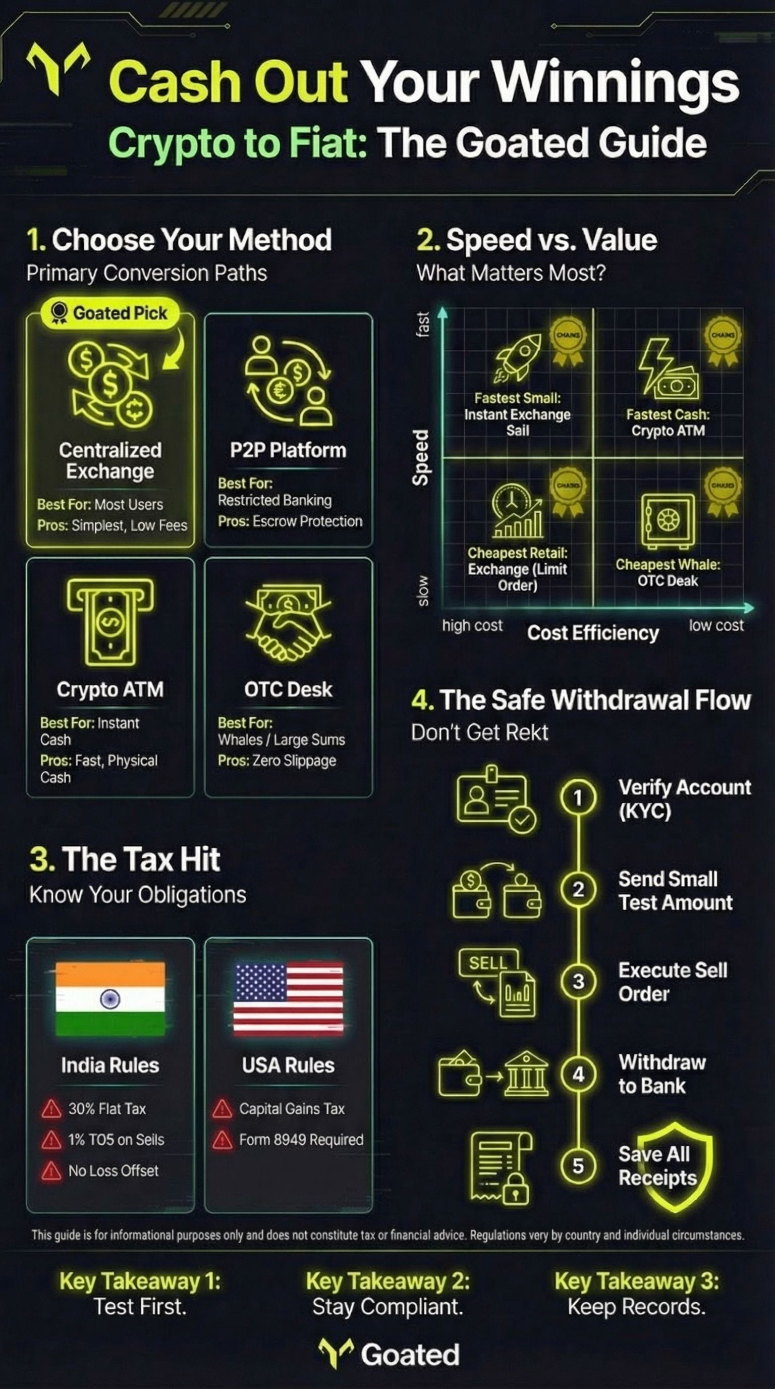 Converting crypto winnings to fiat doesn't have to be complicated. Choose the method that fits your needs, stay compliant with local regulations, and keep thorough records. If you have questions about withdrawing your winnings from Goated, our support team is always available to help.