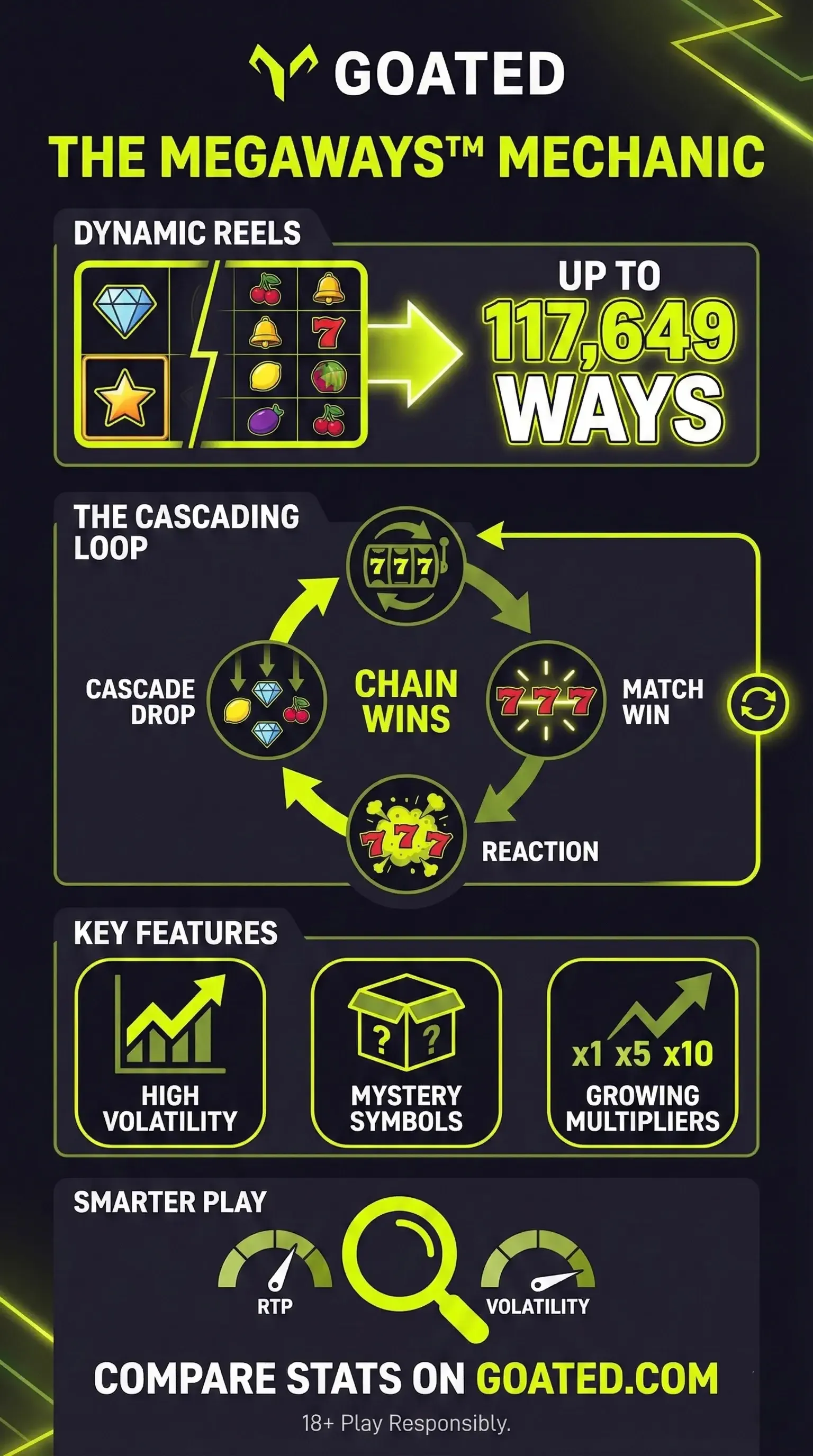 Megaways is a patented slot mechanic from Big Time Gaming that changes the number of symbols on each reel on every spin, creating thousands of dynamic payways instead of fixed paylines. Most 6-reel Megaways games offer up to 117,649 ways to win, pay left-to-right on adjacent reels, and use cascading wins that can chain multiple payouts. Popular add-ons include mystery symbols, expanding reels, and free spins with increasing multipliers. Use Goated to find, compare, and play top Megaways titles responsibly.