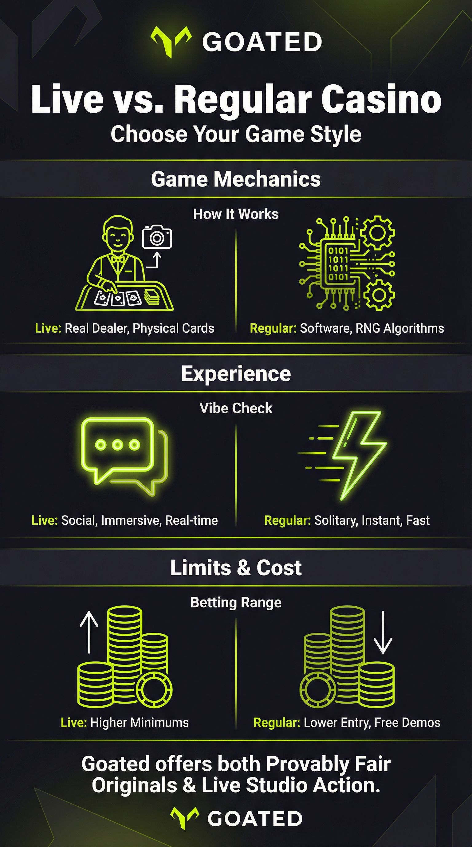 TL;DR: Live casino games feature real human dealers and are streamed in real-time, giving players an authentic casino atmosphere and social interaction. Regular online casino games use software and Random Number Generators (RNGs), offering faster play, broader variety, and often lower minimum bets.